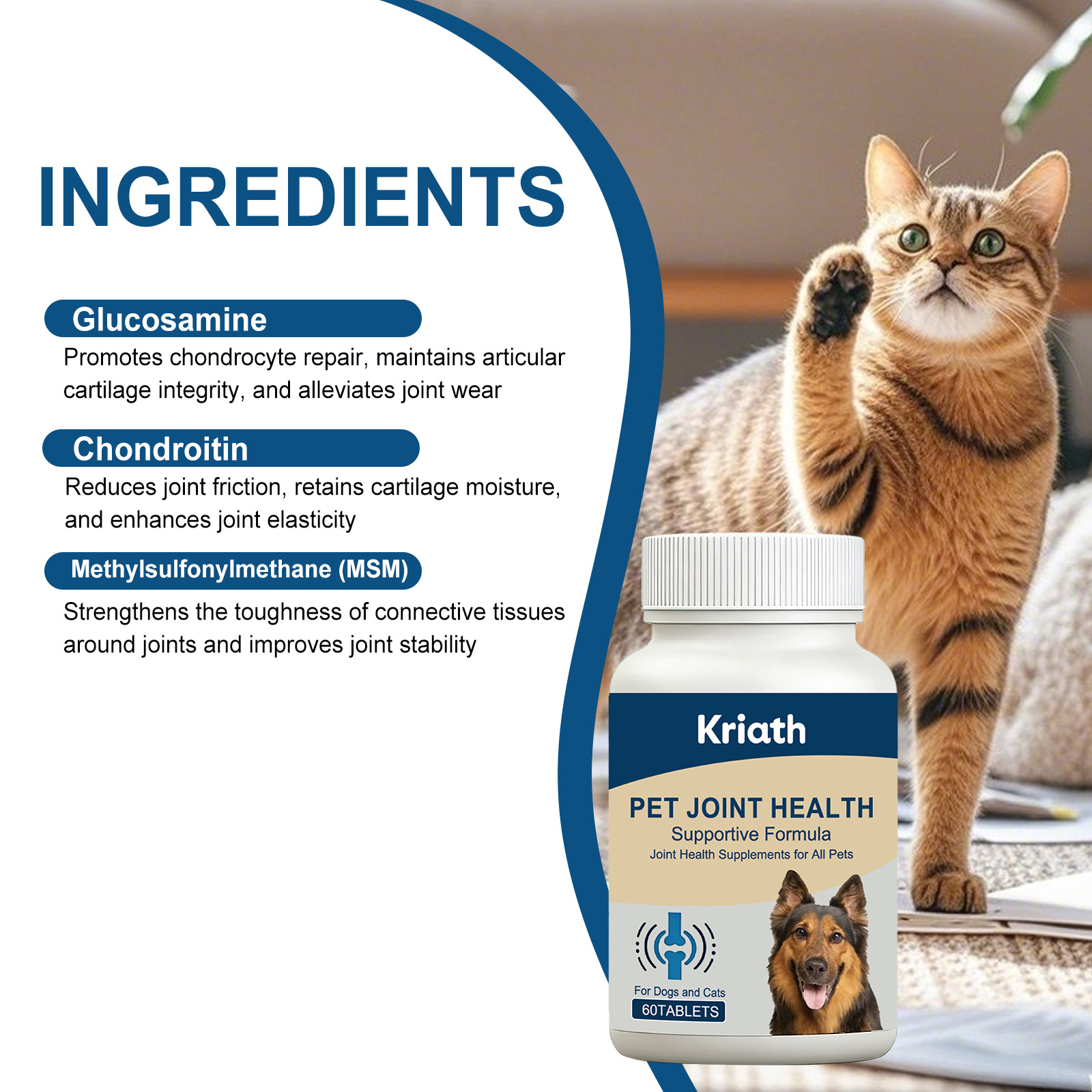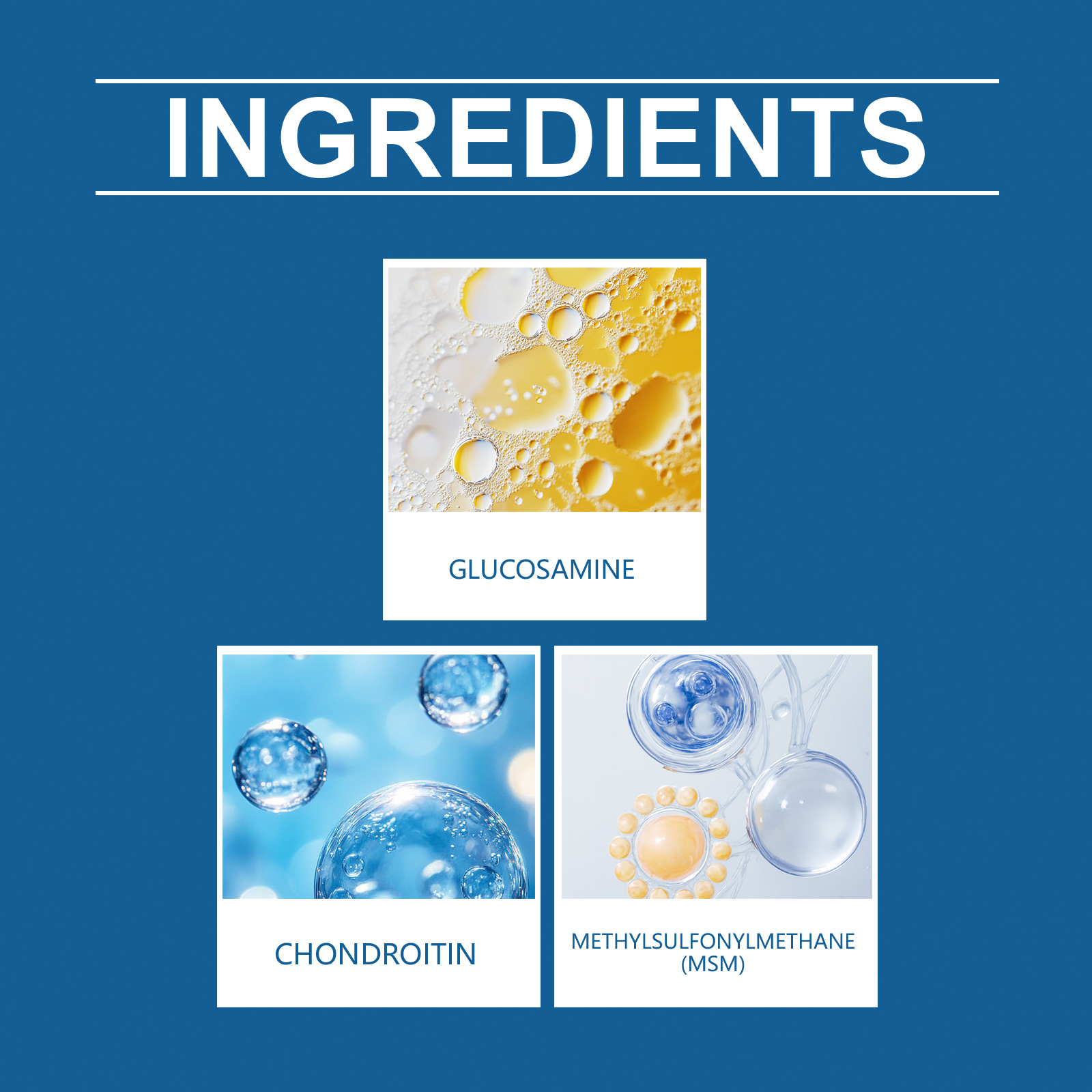 Ingredients: glucosamine, chondroitin, dimethyl sulfone (MSM)